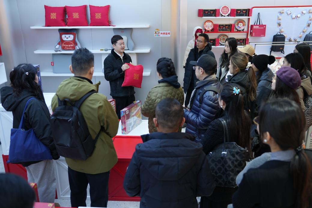 一进入总台文创中塔店,师生团队的注意力便被兼具文化本真性与设计创新性的文创产品体系所吸引:从承载农耕文明节庆记忆、以传统纹样重构年节仪式感的春碗、春盘系列,到将生肖民俗符号进行萌态化转译、适配当代青年审美趣味的吉祥物系列,再到深度活化敦煌文化 IP 的特色作品,每件产品都是 “无形文化 IP 转化为有形情感载体” 的鲜活样本,完整呈现文化符号提炼、价值解读到场景适配的创新逻辑。