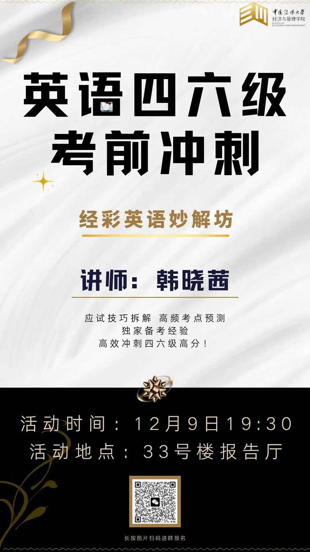讲师分享:韩晓茜老师将侧重四六级应试技巧拆解、高频考点预测、错题规避及答题时间分配等,传授独家备考经验,为同学们进行专题辅导。