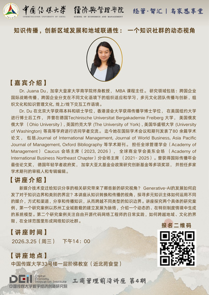 【讲座标题】知识传播,创新区域发展和地域联通性:一个知识社群的动态视角【讲座时间】2026.3.25(周三) 下午14:00【讲座地点】中国传媒大学33号楼一层阶梯教室(近北苑食堂)