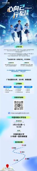 【宣讲时间】3月23日(周一)18:00【宣讲地点】中国传媒大学33号楼一层阶梯教室【公司介绍】InMobi成立于2007年,是全球第二大移动广告公司,也是多年上榜的胡润全球独角兽企业,被《Fast Company》评为“全球最具创...
