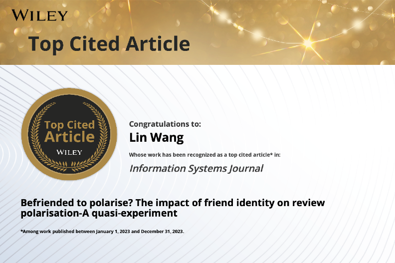 国际知名出版社Wiley公布了旗下数据库2023年度Top Cited Article(年度最高被引论文)榜单,我院青年教师王琳副教授作为第一作者的研究论文成功入选,并获得Wiley出版社颁发的荣誉证书。王琳副教授在ABS 4星期刊《In...